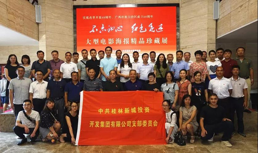 為深入學(xué)習(xí)貫徹落實(shí)習(xí)近平新時(shí)代中國特色社會主義思想和黨的十九大精神,慶祝改革開放40周年、自治區(qū)成立60周年,2018年8月23日上午新城投資集團(tuán)黨支部組織全體黨員和中層副職以上干部參觀“不忘初心?紅色足跡”大型電影海報(bào)精品珍藏展。臨桂新區(qū)工委委員、臨桂新區(qū)管委會副主任覃正東,新城投資集團(tuán)黨支部書記周道林以普通黨員身份參加了此次活動(dòng)。