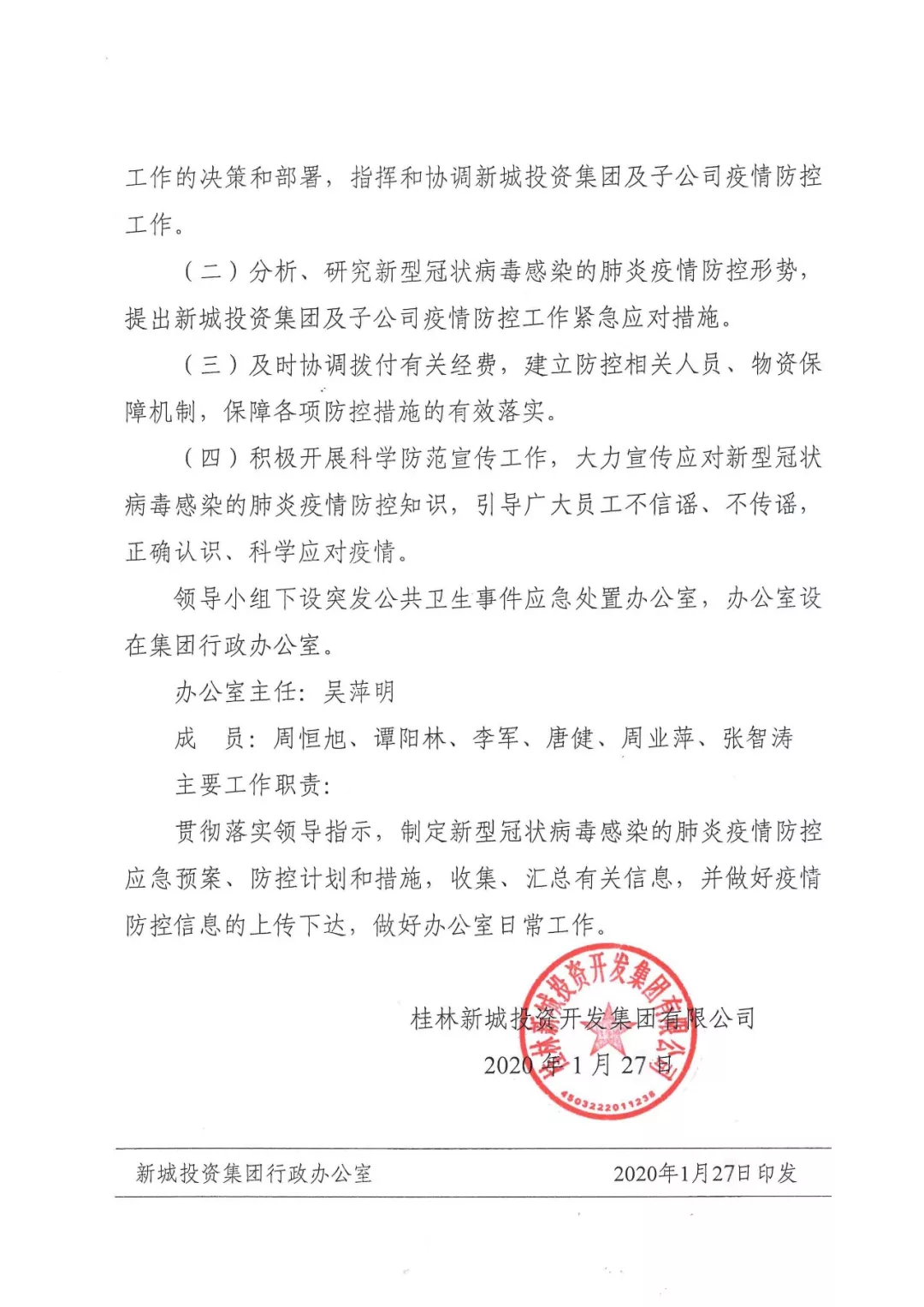 在新春佳節(jié)、闔家團(tuán)聚之際,新型冠狀病毒感染肺炎疫情防控形勢十分嚴(yán)峻。黨中央對(duì)疫情防控工作高度重視,習(xí)近平總書記作出重要指示。自治區(qū)黨委、政府和市委、市政府正在密集部署疫情防控工作,為響應(yīng)切實(shí)打贏疫情防控狙擊戰(zhàn)的戰(zhàn)斗號(hào)召,新城投資集團(tuán)黨支部書記、董事長、總經(jīng)理周道林要求集團(tuán)公司迅速進(jìn)入“戰(zhàn)時(shí)狀態(tài)”,堅(jiān)決貫徹落實(shí)習(xí)近平總書記重要指示和講話精神,把抗擊疫情作為檢驗(yàn)“不忘初心、牢記使命”主題教育成效的又一“試金石”,切實(shí)履行主體責(zé)任和工作職責(zé),及時(shí)掌握疫情,及時(shí)采取行動(dòng),做到守土有責(zé)、守土盡責(zé),堅(jiān)決遏制疫情蔓延勢頭。