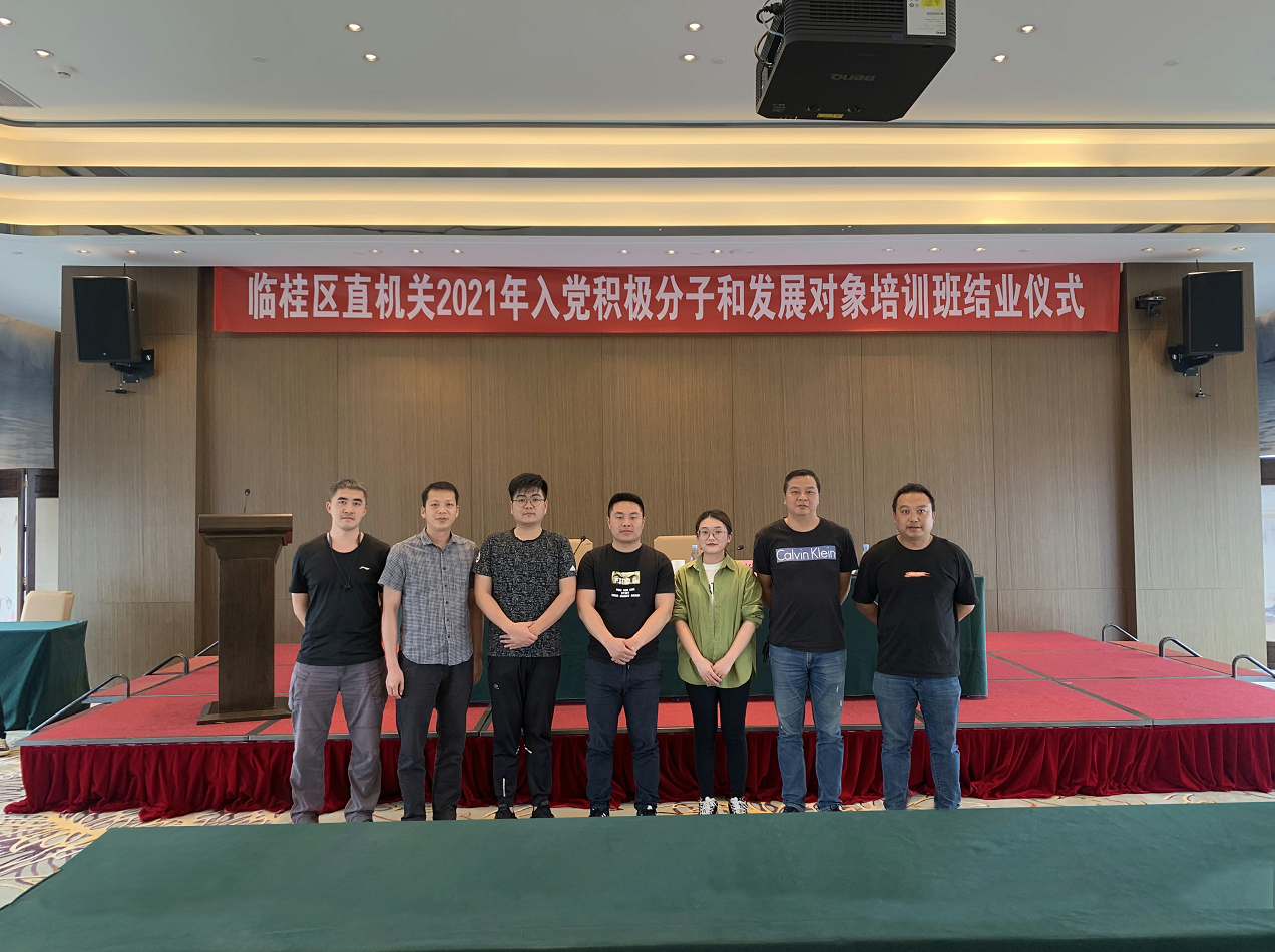 2021年5月24日--28日,臨桂區(qū)直機(jī)關(guān)第七期入黨積極分子及發(fā)展對象培訓(xùn)班在新城投資集團(tuán)下屬桂林宏謀大酒店十樓會(huì)議廳開班。新城投資集團(tuán)盤順民、廖靖宇、梁清淞、尹于、侯文元、張智濤、鄧玉歡等7名入黨積極分子參加培訓(xùn)班學(xué)習(xí)。