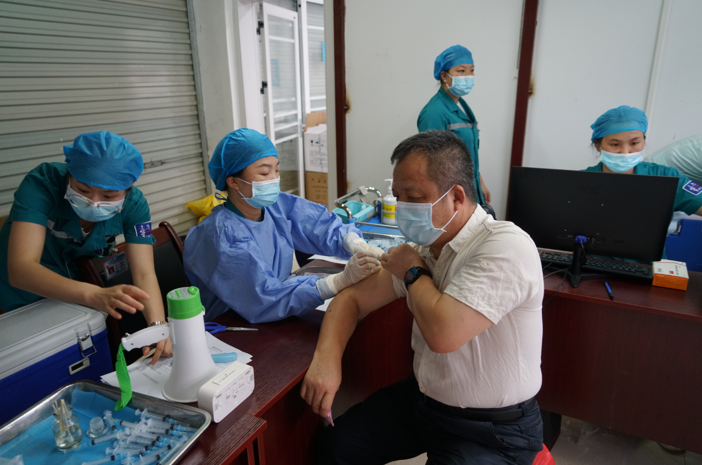 第二針接種流程與第一針相同,現(xiàn)場(chǎng)分為登記區(qū)、錄入?yún)^(qū)、接種區(qū)、留觀區(qū)和緊急處置區(qū)。集團(tuán)黨總支書(shū)記周道林,副總經(jīng)理吳濤,工會(huì)主席譚力源等到現(xiàn)場(chǎng)了解接種現(xiàn)場(chǎng)安排情況并帶頭接種新冠疫苗第二針。