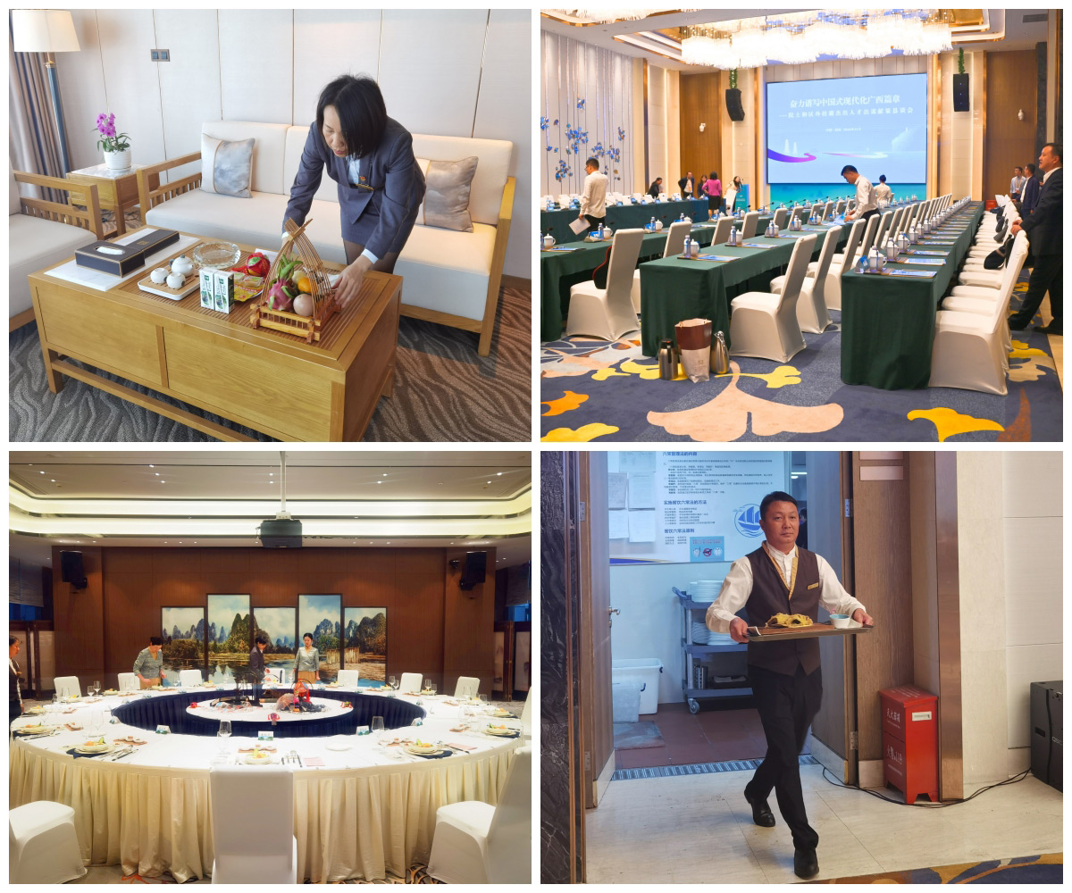 作為本次活動的定點接待酒店,宏謀大酒店精心規(guī)劃、優(yōu)化配置,力求在每一個細節(jié)上做到盡善盡美。酒店房務(wù)部在入住房間內(nèi)準備了應(yīng)季水果、美味小食、營養(yǎng)牛奶及溫馨歡迎卡片,對每一間客房的床品、設(shè)施設(shè)備進行細致檢查,確保嘉賓入住安全、舒適。大會期間,酒店全體員工齊心協(xié)力,順利完成宴會和會議場地的布置工作。餐飲部門更是精心設(shè)計宴會擺臺,從菜單構(gòu)思、食材采購到菜品烹制,每一個環(huán)節(jié)都嚴格把關(guān),全力保障與會嘉賓的用餐安全與品質(zhì)。在接待工作中表現(xiàn)優(yōu)異的酒店員工李軍表示:“我從新城投集團本部行政辦公室調(diào)至宏謀大酒店后,迅速調(diào)整心態(tài),適應(yīng)角色轉(zhuǎn)變,積極融入到全新的工作環(huán)境中。我在完成酒店辦公室日常工作的同時,還經(jīng)常主動延長工作時間,積極參與酒店的重要會議和接待工作中。我作為一位共產(chǎn)黨員和退役軍人,更要在工作中沖鋒在前,充分發(fā)揮共產(chǎn)黨員的先鋒模范作用和軍人恪盡職守的優(yōu)秀品質(zhì),在不一樣的崗位上書寫一樣的人生華章。”