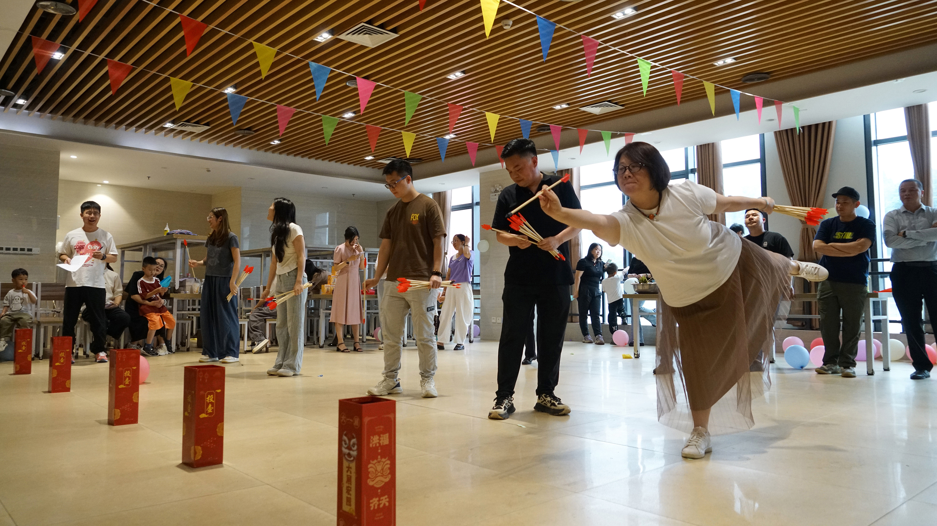 “家企同行·國風(fēng)非遺——民族文創(chuàng),與‘粽’不‘童’”趣味游戲挑戰(zhàn)環(huán)節(jié),將活動氛圍推向高潮。童年紙飛機、端午射五毒、趣味投壺三大趣味游戲讓職工與孩子都沉浸其中。在童年紙飛機游戲中,為了能讓紙飛機飛得更遠(yuǎn)、更久,大家興致勃勃地嘗試著各種折法,隨后用力一擲,紙飛機在空中劃出一道道優(yōu)美的弧線,有的飛得又高又遠(yuǎn),有的則在空中翻轉(zhuǎn)幾圈后穩(wěn)穩(wěn)落地,看著自己折的紙飛機歡呼雀躍,仿佛回到了無憂無慮的童年時光。端午射五毒游戲則充滿了傳統(tǒng)韻味,大家手持飛鏢,瞄準(zhǔn)靶心,每當(dāng)有人射中五毒圖案,周圍就會響起一陣歡呼聲,大家在歡聲笑語中感受著端午節(jié)的傳統(tǒng)習(xí)俗。趣味投壺游戲更是熱鬧非凡,參與者們瞄準(zhǔn)壺口,或站或蹲,調(diào)整著姿勢和力度,隨著一次次投中,現(xiàn)場的氣氛也一次次被點燃,歡呼聲、加油聲此起彼伏。歡聲笑語回蕩在整個活動現(xiàn)場。各組成員在比賽中相互配合、相互鼓勵,展現(xiàn)了團隊合作的力量。最終,根據(jù)各組獲得的總分,評選出冠軍組,大家在歡樂中感受到了團隊的溫暖與力量。