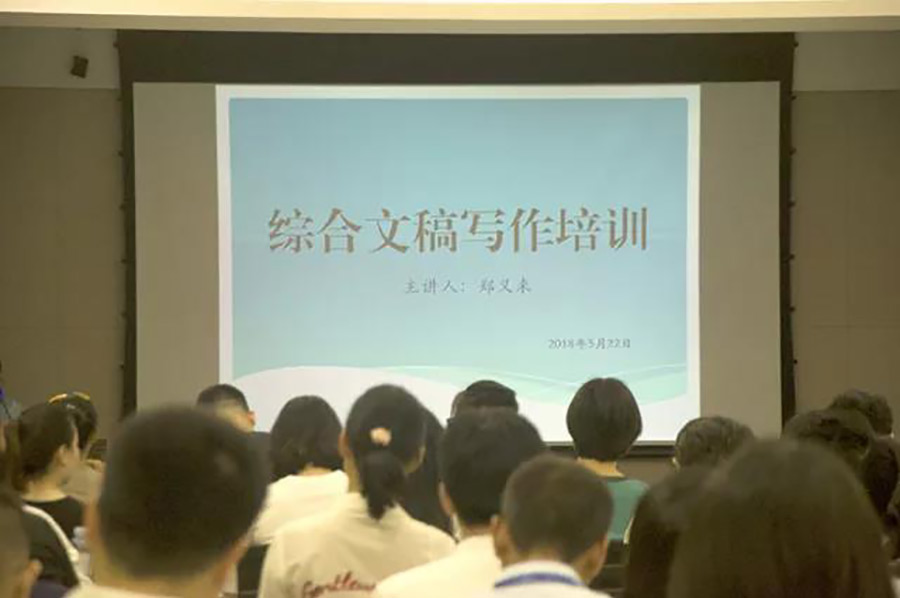 此次培訓邀請到桂林市委辦綜合二科科長鄭義來進行授課。授課內容包括通知、請示、紀要、總結等多個文種的寫作,從各文種的特點、種類、結構和寫法等方面進行講解。