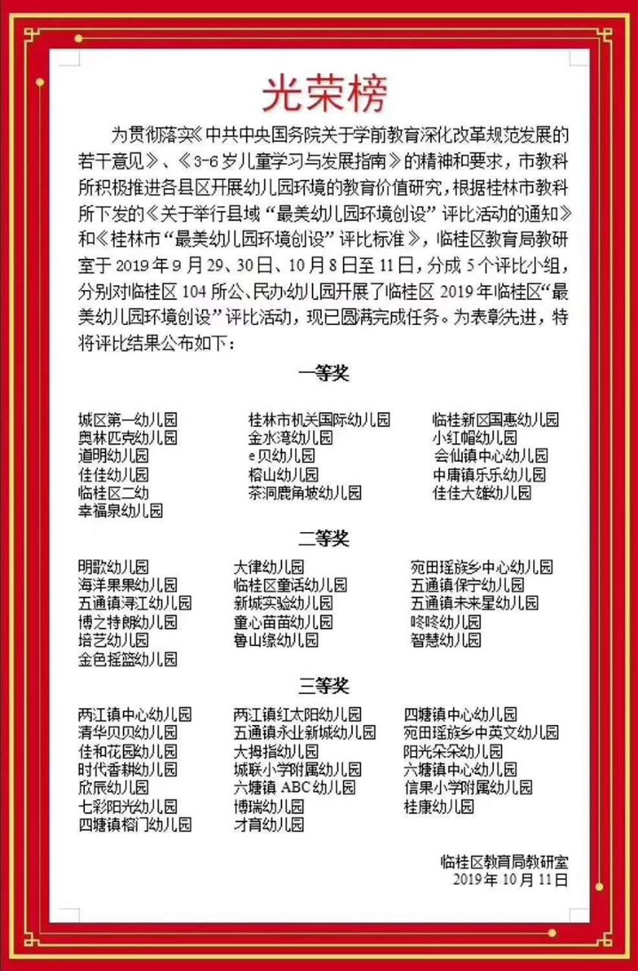 近日,臨桂區(qū)教育局教研室積極推進(jìn)開展幼兒園環(huán)境的教育價(jià)值研究,舉辦了 “最美幼兒園環(huán)境創(chuàng)設(shè)”評比活動(dòng)。國惠幼兒園在評比中榮獲2019年臨桂區(qū)“最美幼兒園環(huán)境創(chuàng)設(shè)”一等獎(jiǎng)。