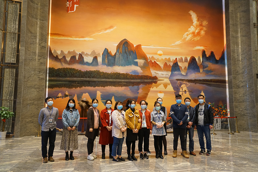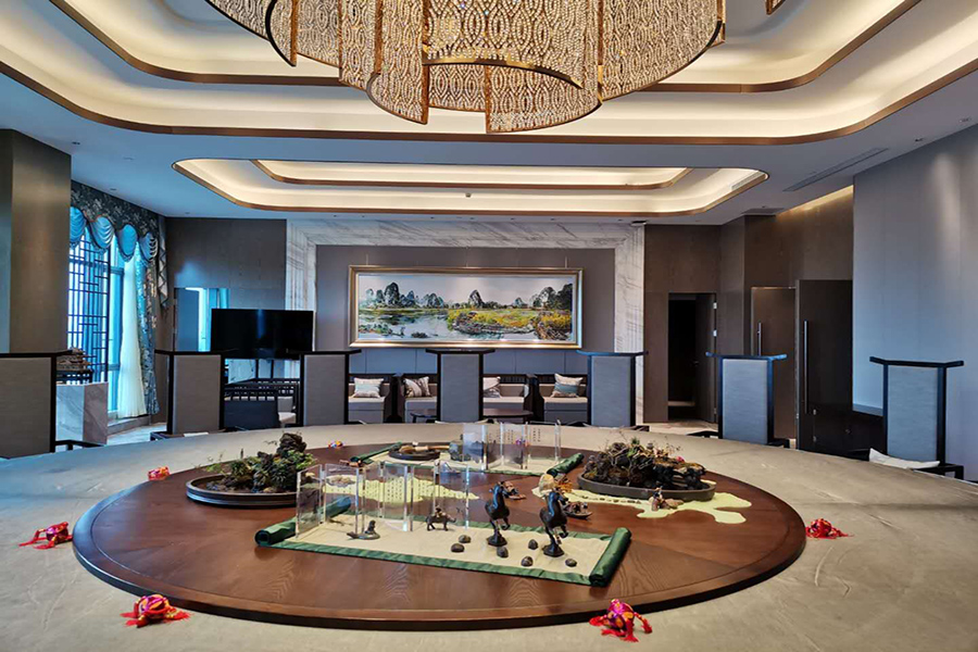 試業(yè)的桂林宏謀大酒店,充分展現(xiàn)現(xiàn)代藝術(shù)酒店的低調(diào)、大氣、有內(nèi)涵。巨型的漓江黃布倒影油畫、璀璨的銅鼓吊燈、云卷的砂巖壁畫……大家被名家友情布展酒店的字畫、雕塑精品的獨特文化氛圍感染,感嘆酒店有深度的藝術(shù)魅力。參觀的員工紛紛駐足拍照,發(fā)朋友圈廣泛宣傳藝術(shù)的宏謀、文化的酒店。