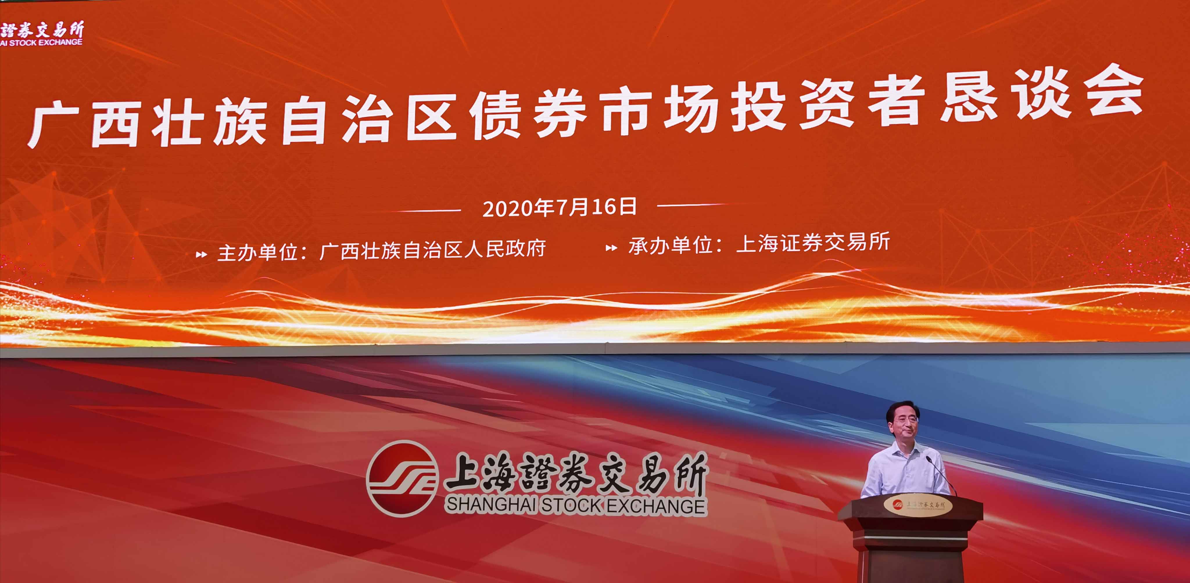 為貫徹落實《中共中央 國務(wù)院關(guān)于新時代推進西部大開發(fā)形成新格局的指導(dǎo)意見》,提升西部地區(qū)直接融資比例,切實提升廣西債券融資能力,助推廣西經(jīng)濟高質(zhì)量發(fā)展,廣西壯族自治區(qū)人民政府于2020年7月16日在上海證券交易所舉辦了廣西壯族自治區(qū)債券市場投資者懇談會。國泰君安證券、申港證券、交通銀行等國內(nèi)30余家金融機構(gòu)代表及廣西投資集團、北部灣投資集團、廣西物質(zhì)集團、柳州東城集團等20余家廣西區(qū)內(nèi)大型知名企業(yè)參加了本次懇談會。上海證券交易所黨委書記、理事長黃紅元(副部長級)出席會議,上海證券交易所副副總經(jīng)理劉紹統(tǒng)、廣西區(qū)人大常委會副主任張曉欽先后致辭發(fā)言,廣西金融監(jiān)管局、廣西財政廳負責(zé)人介紹了廣西債券發(fā)行工作情況。
