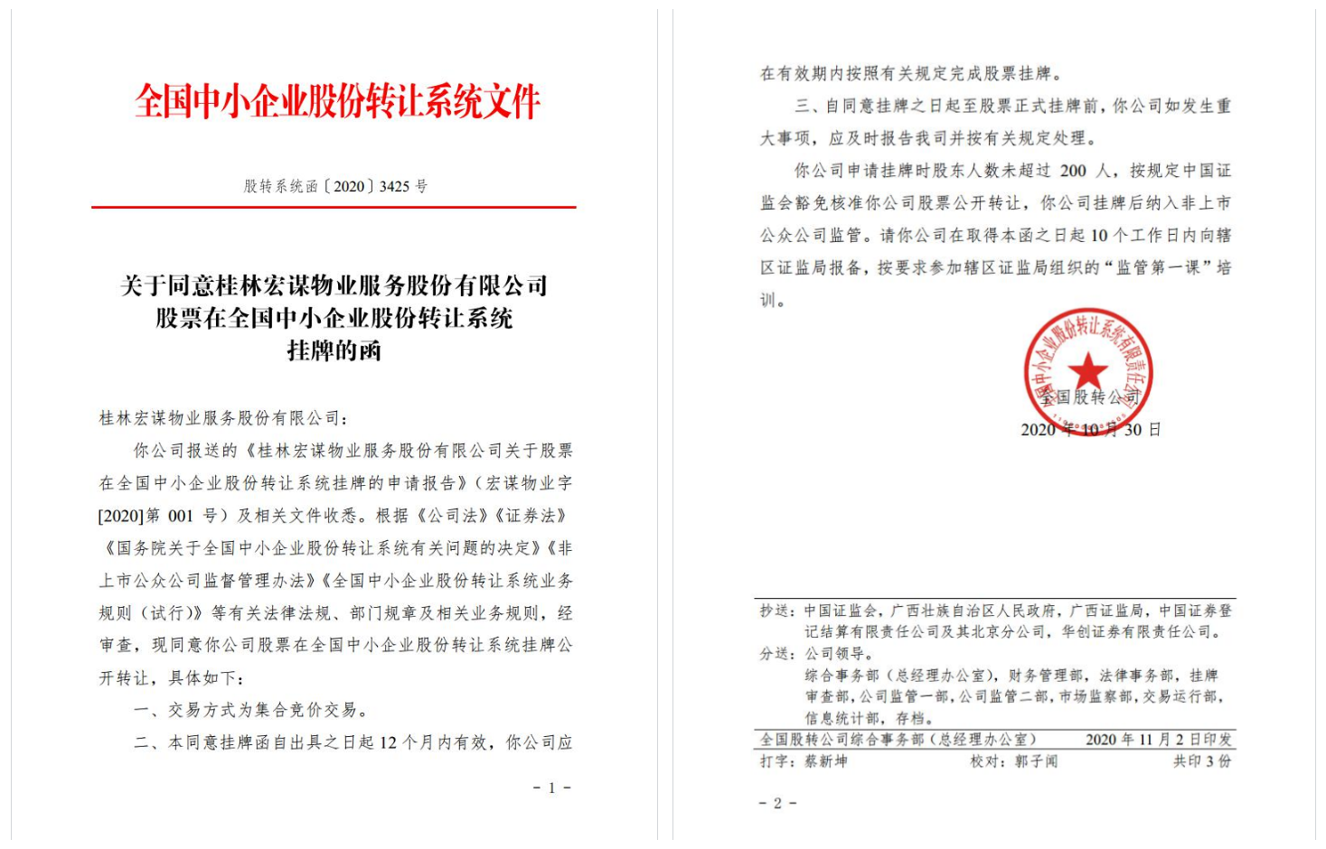 2020年12月9日下午,桂林新城投資開發(fā)集團有限公司下屬子公司桂林宏謀物業(yè)服務(wù)股份有限公司在全國中小企業(yè)股份轉(zhuǎn)讓系統(tǒng)即新三板上市。桂林宏謀物業(yè)服務(wù)股份有限公司(股票簡稱:宏謀物業(yè);股票代碼:873532)成為桂林市第一家在新三板上市的國企物業(yè)公司。
