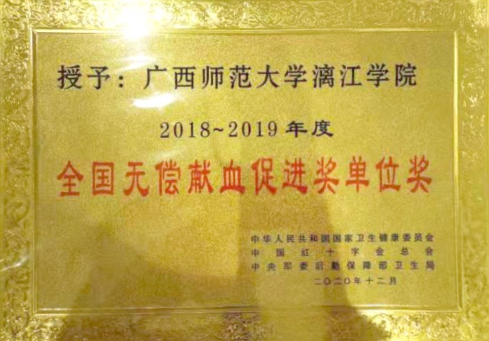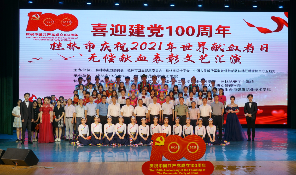 6月9日,由桂林市獻(xiàn)血委員會、桂林市衛(wèi)生健康委員會、桂林市紅十字會、中國人民解放軍聯(lián)勤保障部隊(duì)桂林聯(lián)勤保障中心衛(wèi)勤處主辦,桂林市中心血站、廣西師范大學(xué)漓江學(xué)院承辦的“喜迎建黨100周年桂林市慶祝2021年世界獻(xiàn)血者日無償獻(xiàn)血表彰文藝匯演”活動在漓江學(xué)院召開。漓江學(xué)院獲得全場唯一“全國無償獻(xiàn)血促進(jìn)獎單位獎”。