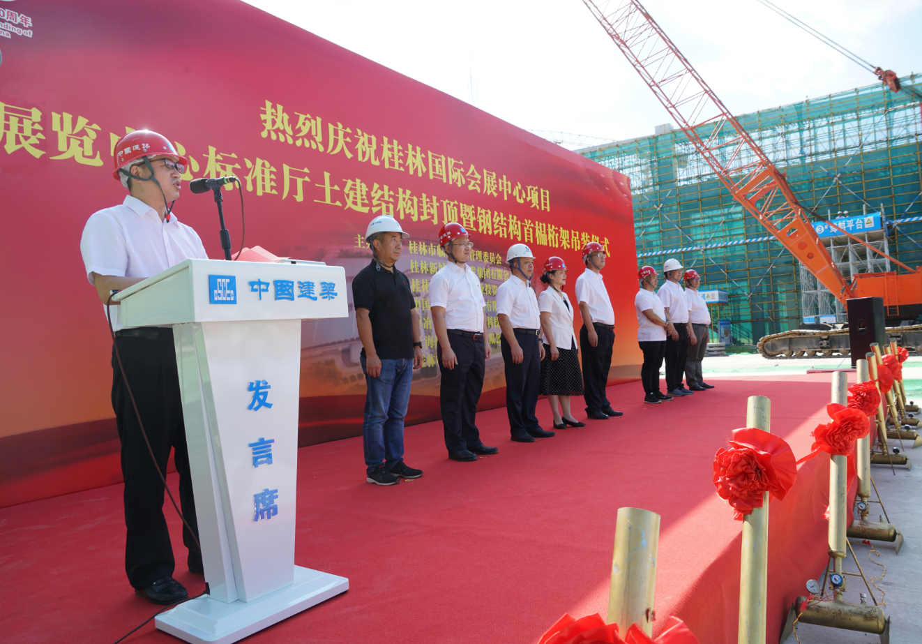 7月13日,桂林國(guó)際會(huì)展中心項(xiàng)目展覽中心標(biāo)準(zhǔn)廳土建結(jié)構(gòu)封頂暨鋼結(jié)構(gòu)首榀桁架吊裝儀式圓滿舉行。