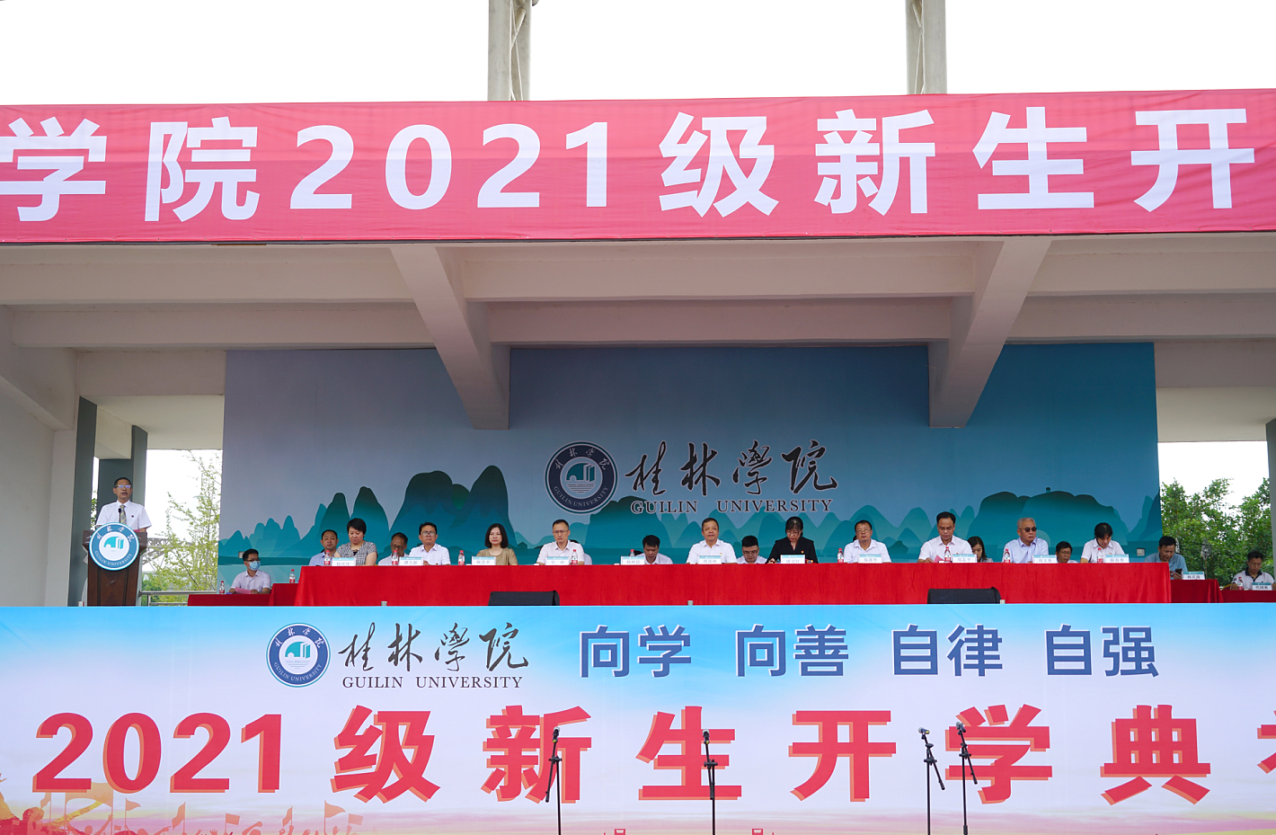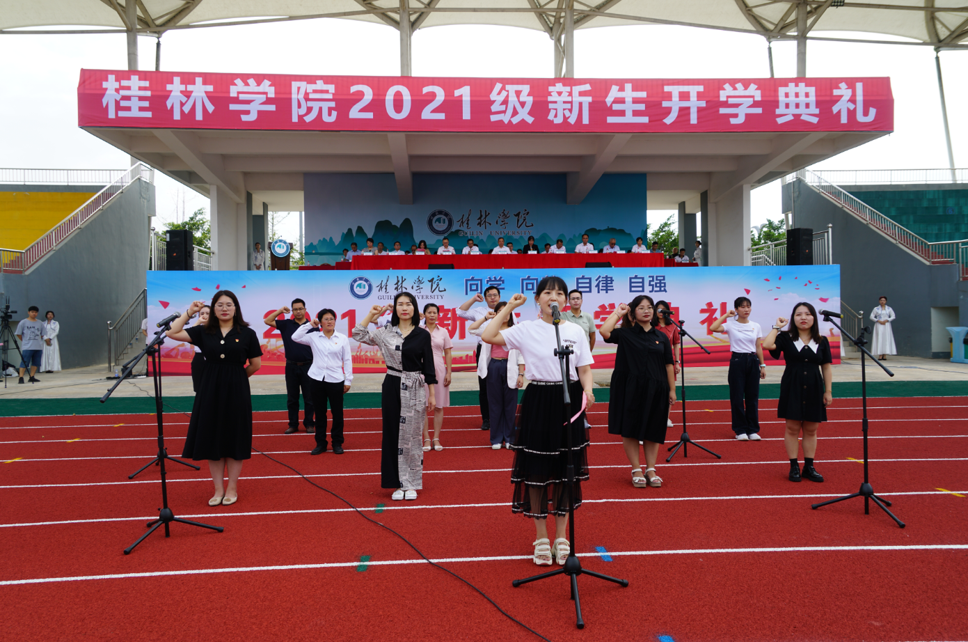 9月17日上午,桂林學(xué)院2021級(jí)新生開學(xué)典禮在學(xué)校田徑場舉行。2021級(jí)來自全國各地的3160名新生和新生親友通過現(xiàn)場與視頻直播相結(jié)合的形式,共同參加和觀看了開學(xué)典禮。桂林學(xué)院董事長周道林,桂林學(xué)院校長楊樹喆以及學(xué)校董事、監(jiān)事、校領(lǐng)導(dǎo)出席典禮。各二級(jí)學(xué)院、職能教輔部門主要負(fù)責(zé)人,各黨總支書記、副書記,全體新生輔導(dǎo)員,教師代表,校友代表參加典禮。開學(xué)典禮由校黨委書記唐文紅主持。