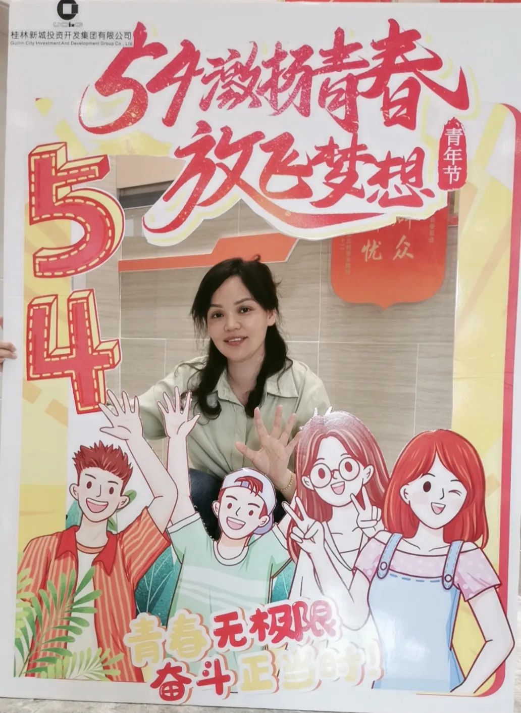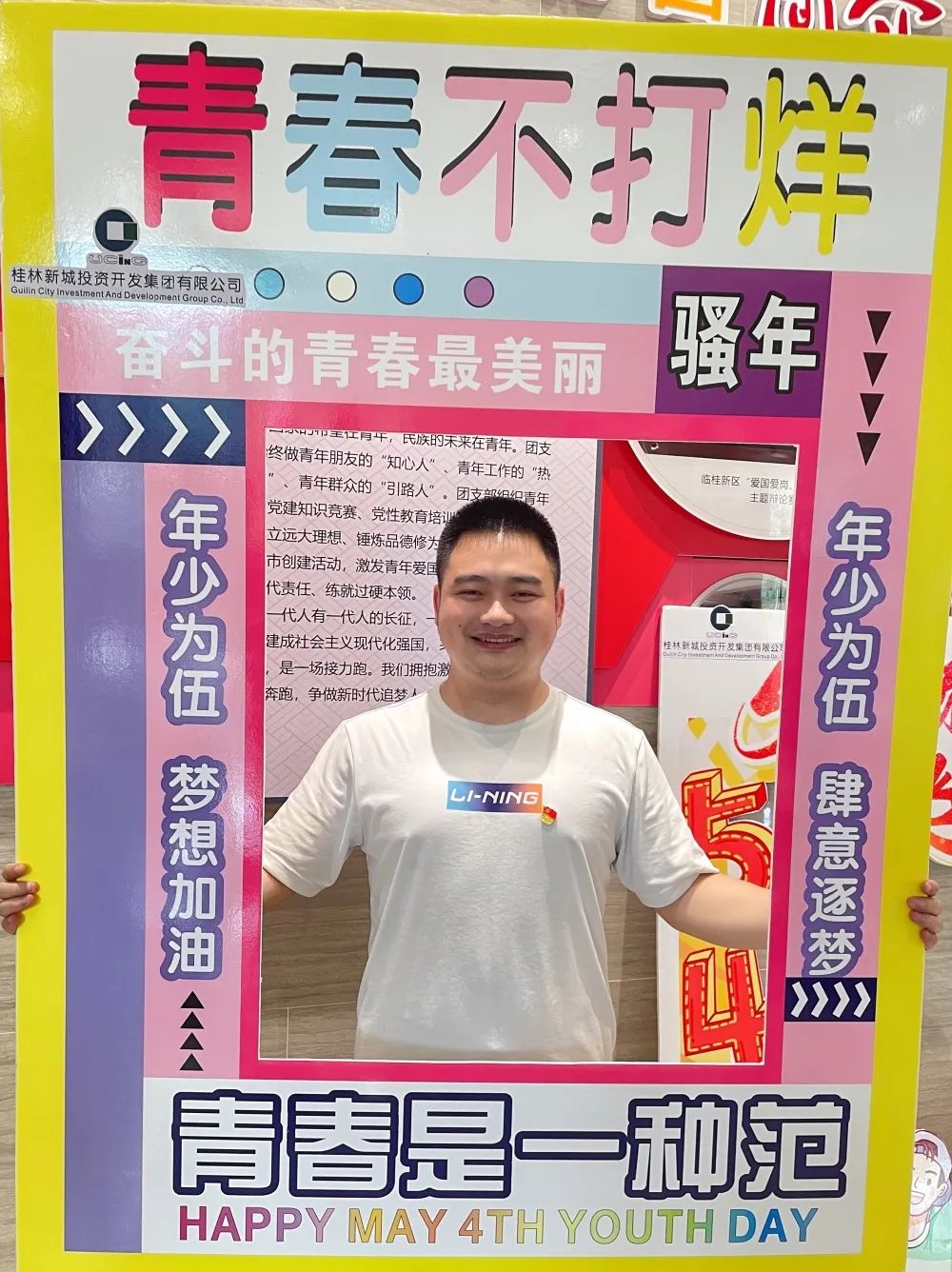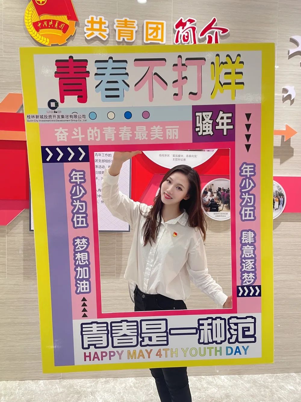 公司一樓大廳,團支部布置了“五四主題”畫框打卡活動,熱烈慶祝五四青年節(jié)到來。周道林帶頭打卡,并鼓勵全體員工積極參與拍照打卡活動,渲染喜慶的節(jié)日氛圍。