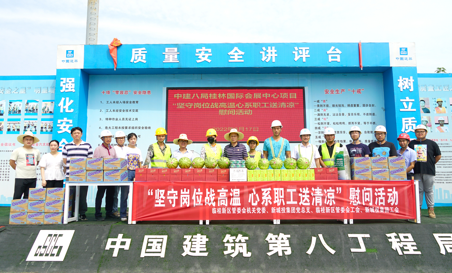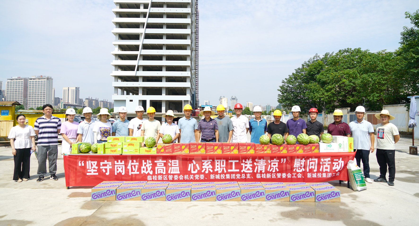 入伏以來,我市驕陽似火,高溫難耐。為切實(shí)做好桂林新區(qū)重點(diǎn)項(xiàng)目建設(shè)者的防暑降溫工作,保障建設(shè)者安全度伏,促進(jìn)重大項(xiàng)目安全生產(chǎn),2022年8月17日,一場由臨桂新區(qū)管委會(huì)機(jī)關(guān)黨委和新城投集團(tuán)黨總支主辦,新區(qū)管委會(huì)工會(huì)和新城投集團(tuán)工會(huì)承辦的“堅(jiān)守崗位戰(zhàn)高溫,心系職工送清涼”慰問活動(dòng)依次在北區(qū)湖塘水系連通工程項(xiàng)目、國際會(huì)展中心項(xiàng)目、興桂園項(xiàng)目建設(shè)一線開展。