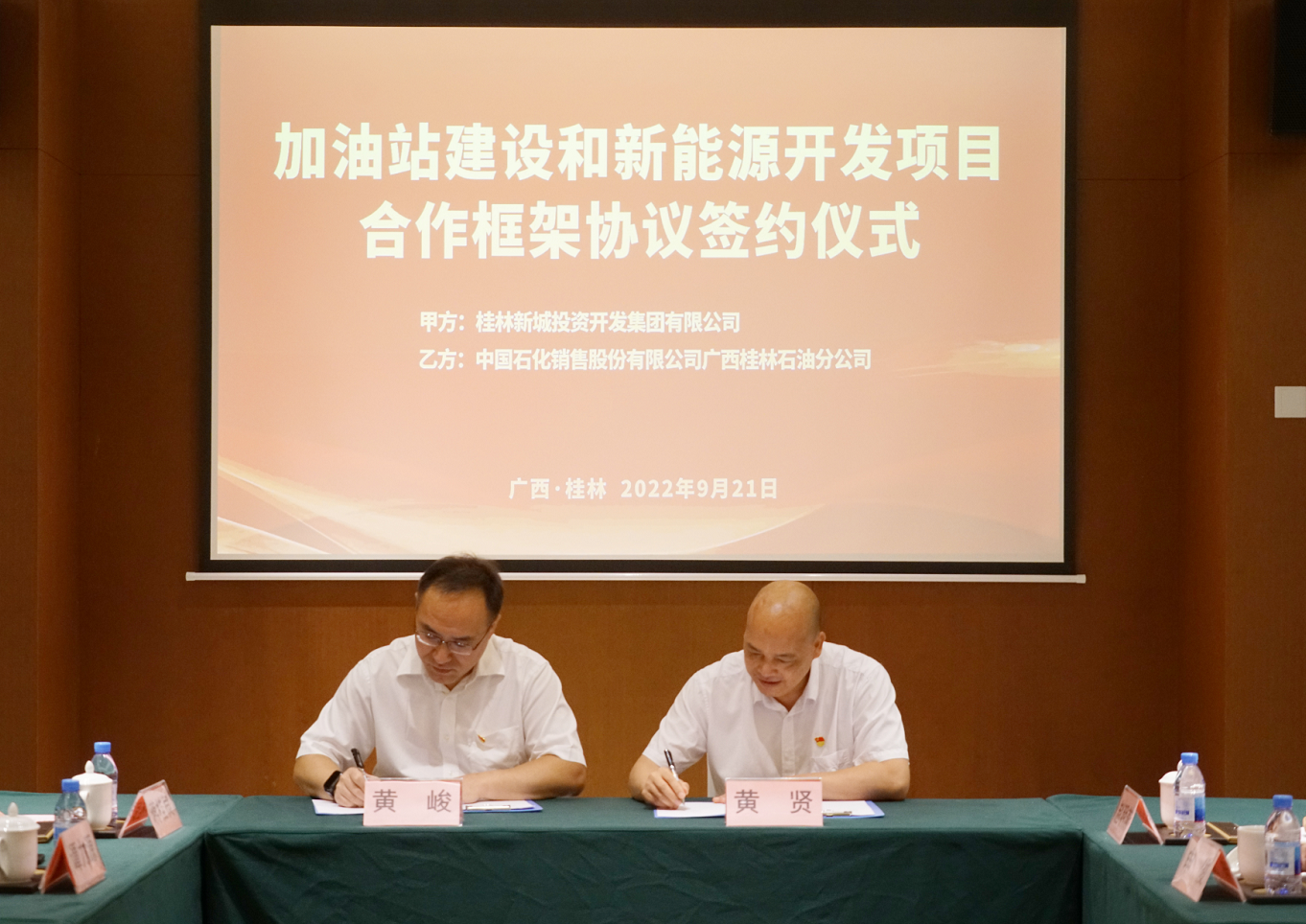 2022年9月21日,桂林新城投資開發(fā)集團(tuán)有限公司(以下簡(jiǎn)稱新城投集團(tuán))與中國(guó)石化銷售股份有限公司廣西桂林石油分公司(以下簡(jiǎn)稱中石化桂林分公司)在桂林宏謀大酒店舉行桂林新區(qū)加油站建設(shè)和新能源開發(fā)項(xiàng)目合作框架協(xié)議簽約儀式。臨桂新區(qū)黨工委委員、管委會(huì)常務(wù)副主任李星明,黨工委委員、管委會(huì)副主任張慧慶,新城投集團(tuán)黨總支副書記、總經(jīng)理黃峻,中石化桂林分公司總經(jīng)理黃賢出席簽約儀式。簽約儀式由新城投集團(tuán)副總經(jīng)理吳濤主持。