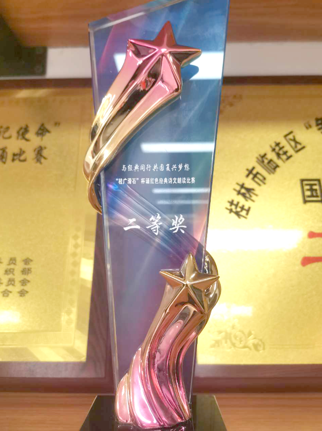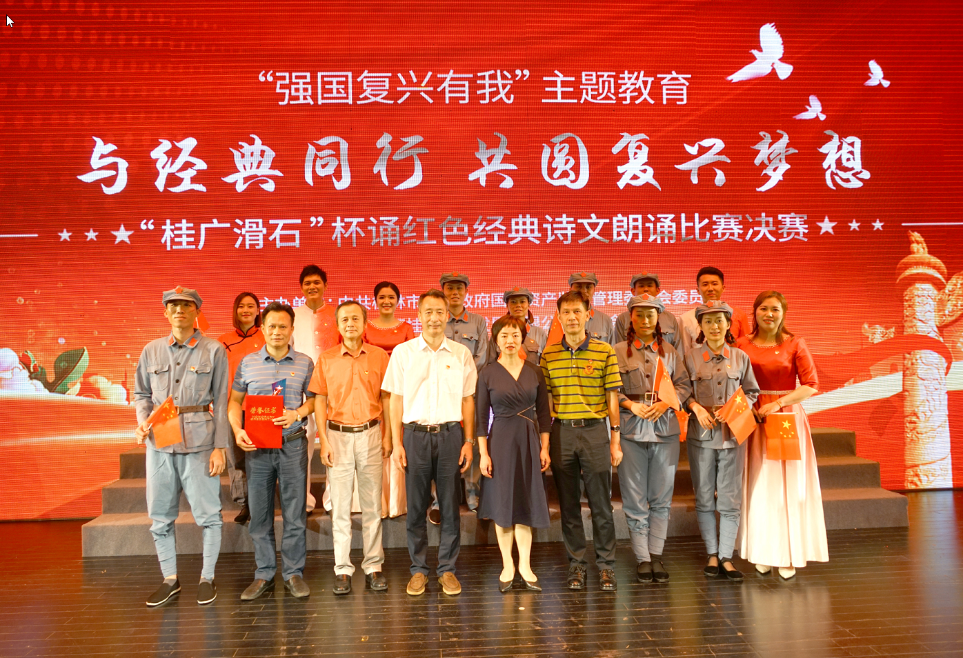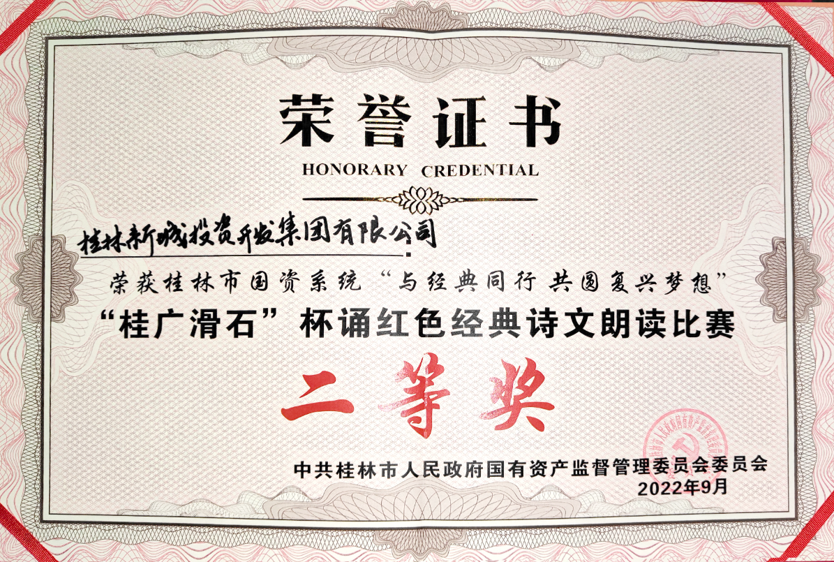 為彰顯傳統(tǒng)文化的獨特魅力,傳承千年優(yōu)良經(jīng)典文化與紅色基因,2022年9月23日,由桂林市人民政府國有資產(chǎn)監(jiān)督管理委員會主辦的“強國復興有我”主題教育——“與經(jīng)典同行,共圓復興夢想”誦紅色經(jīng)典詩文朗讀比賽(決賽)在一院兩館小劇場舉行。本次比賽評出一等獎2個,二等獎3個,三等獎4個。新城投集團選送的詩朗誦情景劇《不朽的軍魂》憑借真摯的情感,轉(zhuǎn)折起伏的情節(jié),從19支決賽隊伍中脫穎而出,獲得二等獎的好成績。桂林市國資委黨委書記、主任裴軍等出席活動。