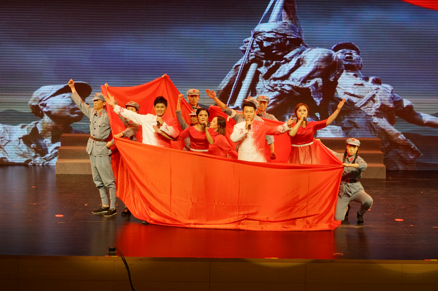節(jié)目參演的12人分別來自集團公司各部室、子公司的一線崗位。為了就老師空余時間集合排練,大家犧牲周末、中秋、下班晚上時間練舞、朗誦,分工不分家,相互配合,一點不含糊,一個多月的排練,才換來了這次來之不易的集體榮譽。他們用真摯的情感和生動的語言,演繹了紅五團里一面彈跡斑斑的英雄戰(zhàn)旗的故事。這面戰(zhàn)旗引領大家穿越時空,重回革命年代,身臨其境地感受革命先烈們的偉大情懷和感天動地的英雄事跡,一句句飽含真情的臺詞,誦出了新城投人對黨深情而堅定、樸素而真摯的告白,贏得了現(xiàn)場觀眾和評委的陣陣掌聲。