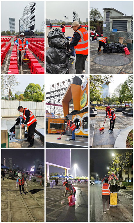 為營造整潔有序的活動氛圍,公司積極履行活動現(xiàn)場環(huán)境衛(wèi)生保障職責,出動了10余名保潔人員及2臺垃圾清運車組成“清潔衛(wèi)士”隊伍,對廣場內(nèi)的塑料飯盒、礦泉水瓶、包裝袋、發(fā)光棒、煙頭等垃圾進行“地毯式”清理,同時對廣場周邊的28個垃圾桶進行合理調(diào)整布局,增加垃圾清運次數(shù),做到垃圾不堆積、不滯留?;顒赢斕?,“清潔衛(wèi)士”隊伍加大清掃頻次,延長保潔時間,及時發(fā)現(xiàn)并解決環(huán)境衛(wèi)生問題,共為800名工作、安保人員及上千名觀眾清理了260余包垃圾?;顒忧昂?2天,清理枯枝落葉、舞臺垃圾等總計達5噸,確保活動場地環(huán)境舒適與衛(wèi)生。