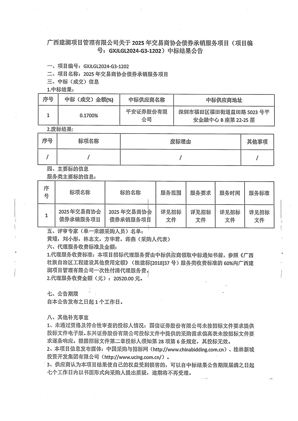 廣西建瀾項(xiàng)目管理有限公司關(guān)于2025年交易商協(xié)會(huì)債券承銷服務(wù)項(xiàng)目(項(xiàng)目編號(hào):GXJLGL2024-G3-1202)中標(biāo)結(jié)果公告