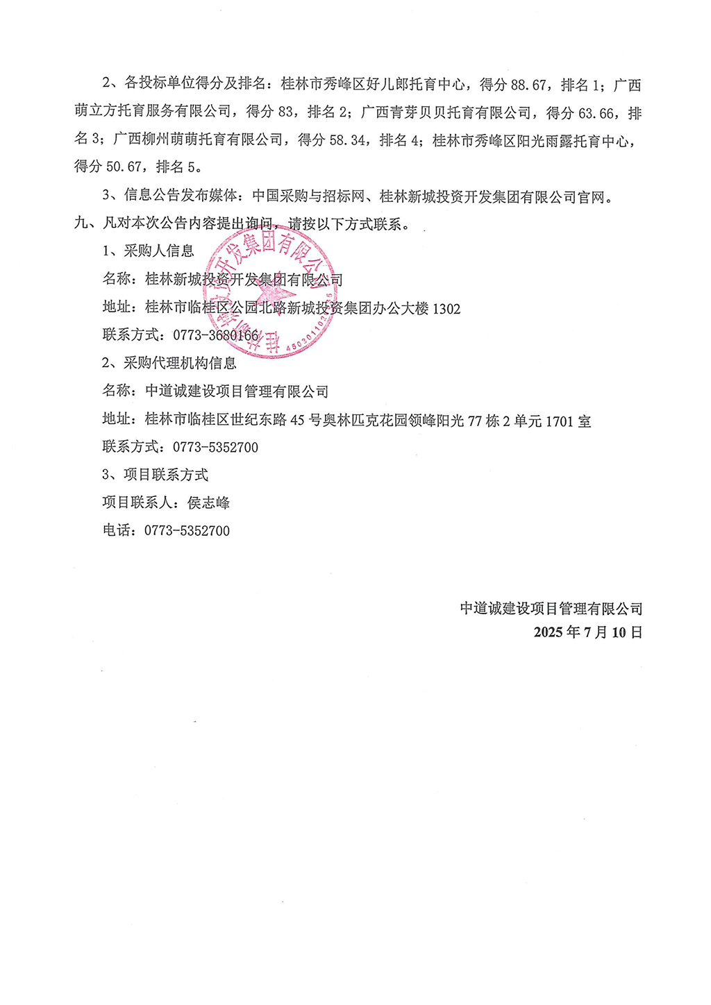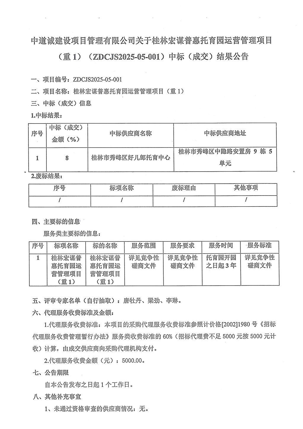 中道誠建設(shè)項目管理有限公司關(guān)于桂林宏謀普惠托育園運營管理項目(重1)(ZDCJS2025-05-001)中標(成交)結(jié)果公告