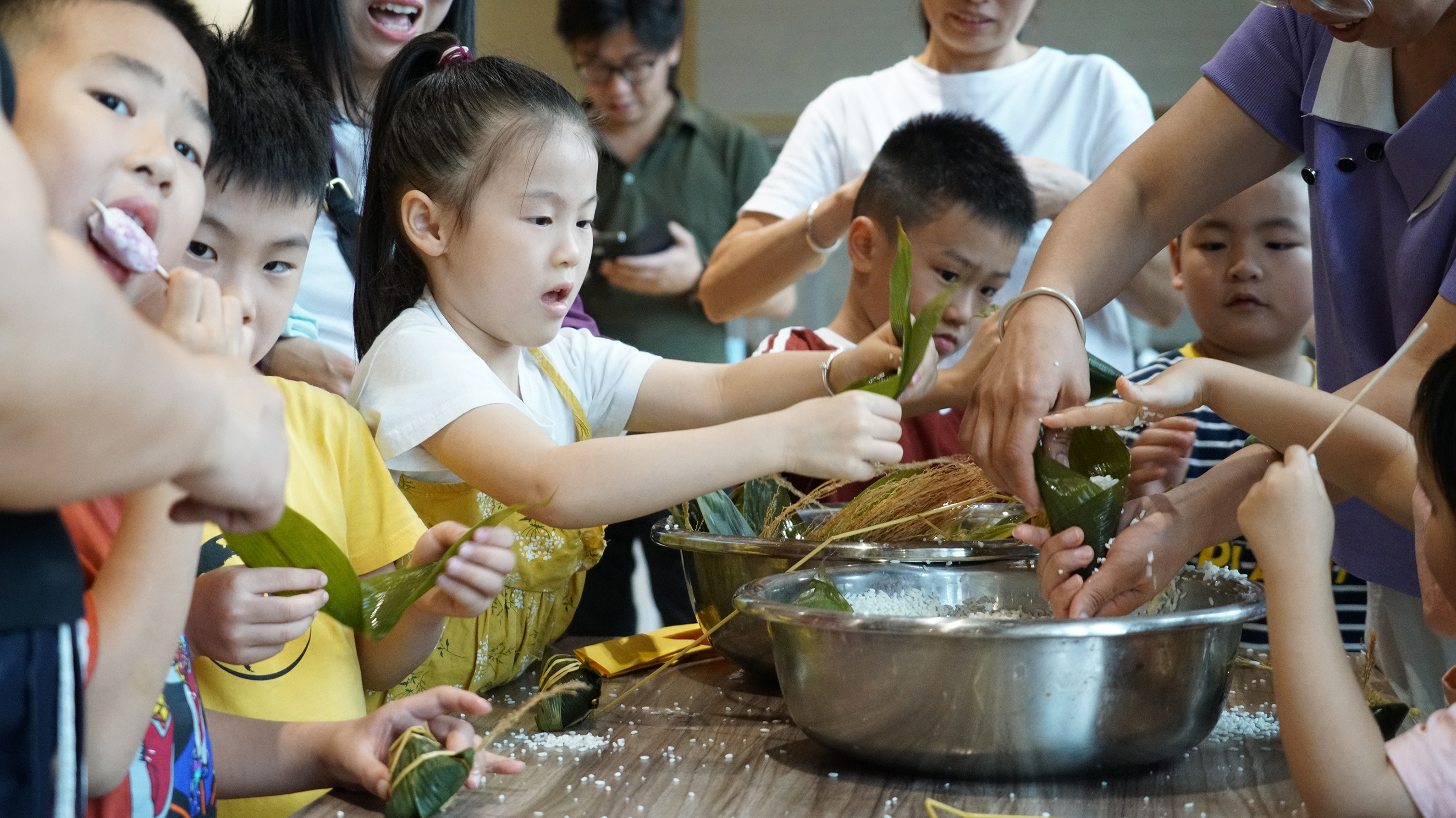 游戲環(huán)節(jié)結(jié)束后,大家開始包粽子、做香囊,孩子們圍著長桌,小手笨拙又興奮地學(xué)著大人的模樣包粽子、做香囊,翠綠寬大的粽葉在他們手中顯得有些調(diào)皮,不是卷不成錐形,就是裹不緊邊角。另一邊的角落,則是五彩斑斕的香囊世界,孩子們圍坐在一起,桌上鋪滿了色彩鮮艷的綢布、五彩絲線、亮晶晶的小珠子,還有散發(fā)著濃郁草藥香氣的艾草和菖蒲碎。他們用小手仔細地挑選著心儀的布料,小心翼翼地裁剪成小小的口袋形狀。穿針引線對他們來說是個不小的挑戰(zhàn),小眉頭微微蹙起,線頭有時會調(diào)皮地打結(jié),但他們依然樂此不疲。通過包粽子、做香囊使孩子們深入了解中國各民族在端午節(jié)的悠久歷史和豐富的非遺傳承文化,感受到傳統(tǒng)文化的獨特魅力。